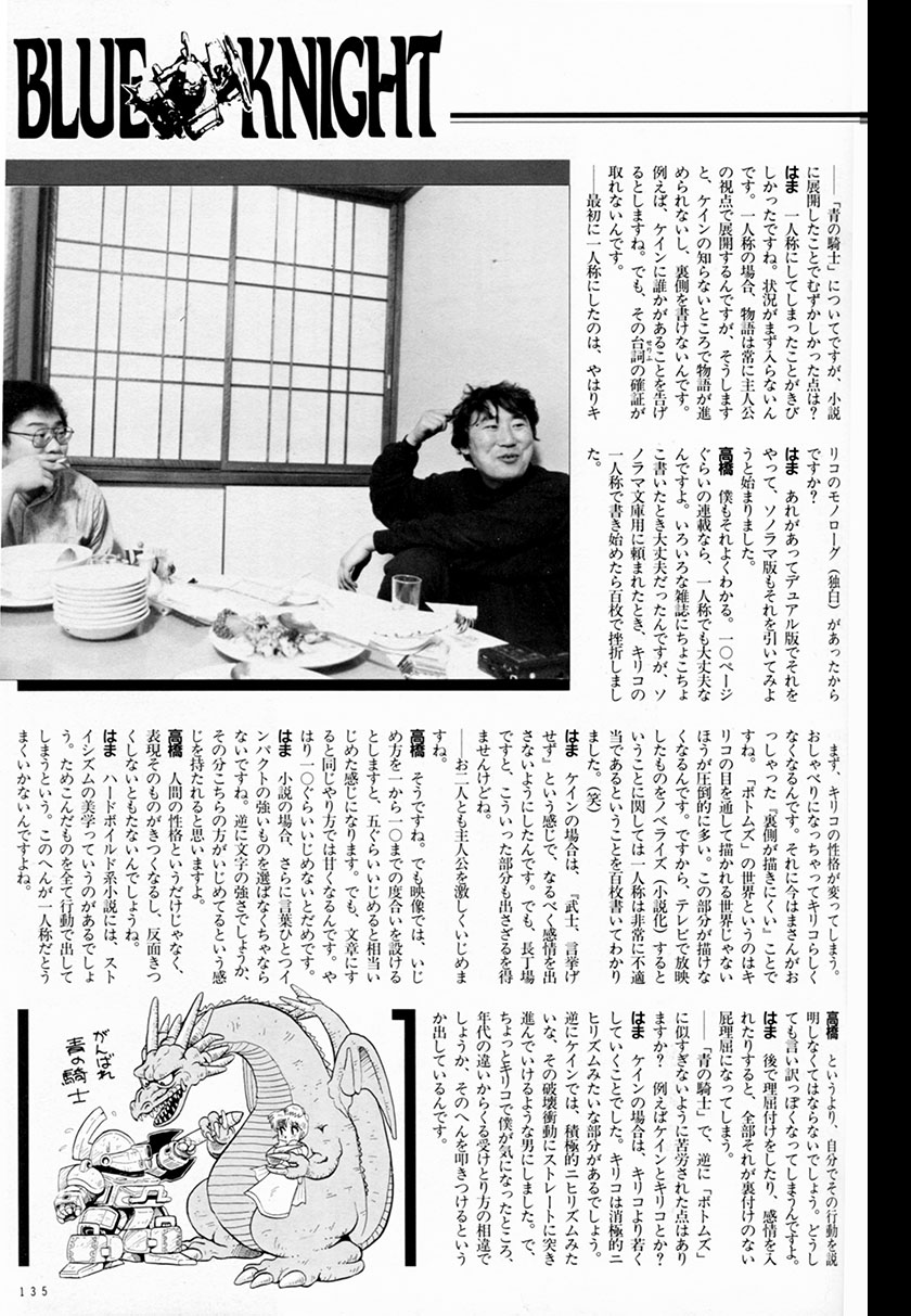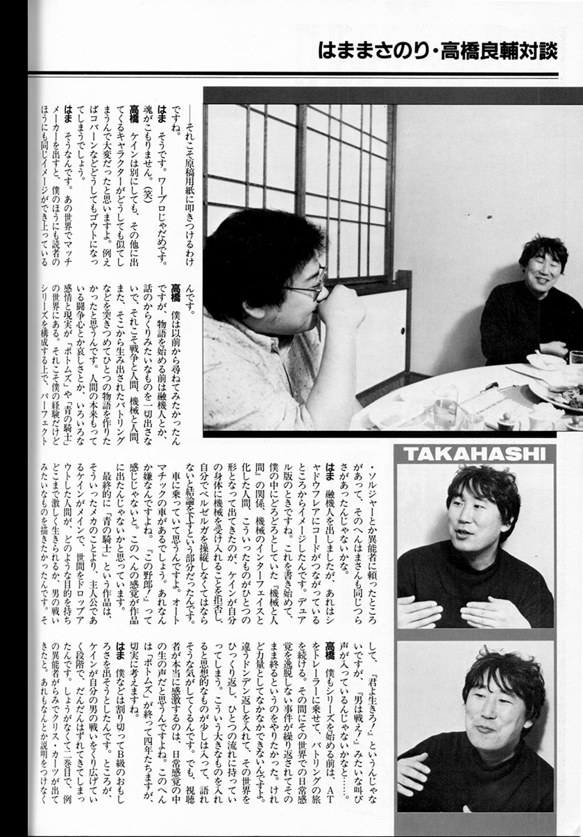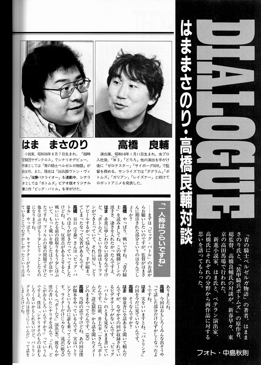 A conversation between Masanori Hama, author of Blue Knight Berserga Story, and Ryosuke Takahashi, the original author and general director of Armored Trooper Votoms, was held at Takadanobaba, Tokyo. We asked Hama, an up-and-coming novelist, and Takahashi, a veteran director, to share their thoughts on both works from their respective fields.