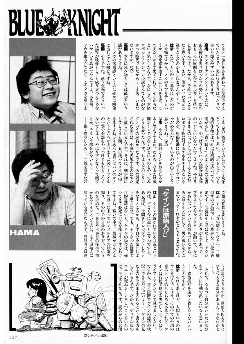 Visually, there are far more depictions of those in Votoms than in other works, but if I were to write something like Blue Knight, those parts would probably be about one-fifth of what they currently are. Hama-san is a single author, after all. I think the energy he has for robots is expressed in the script. “A word processor alone won’t do,” right? (Laughs)