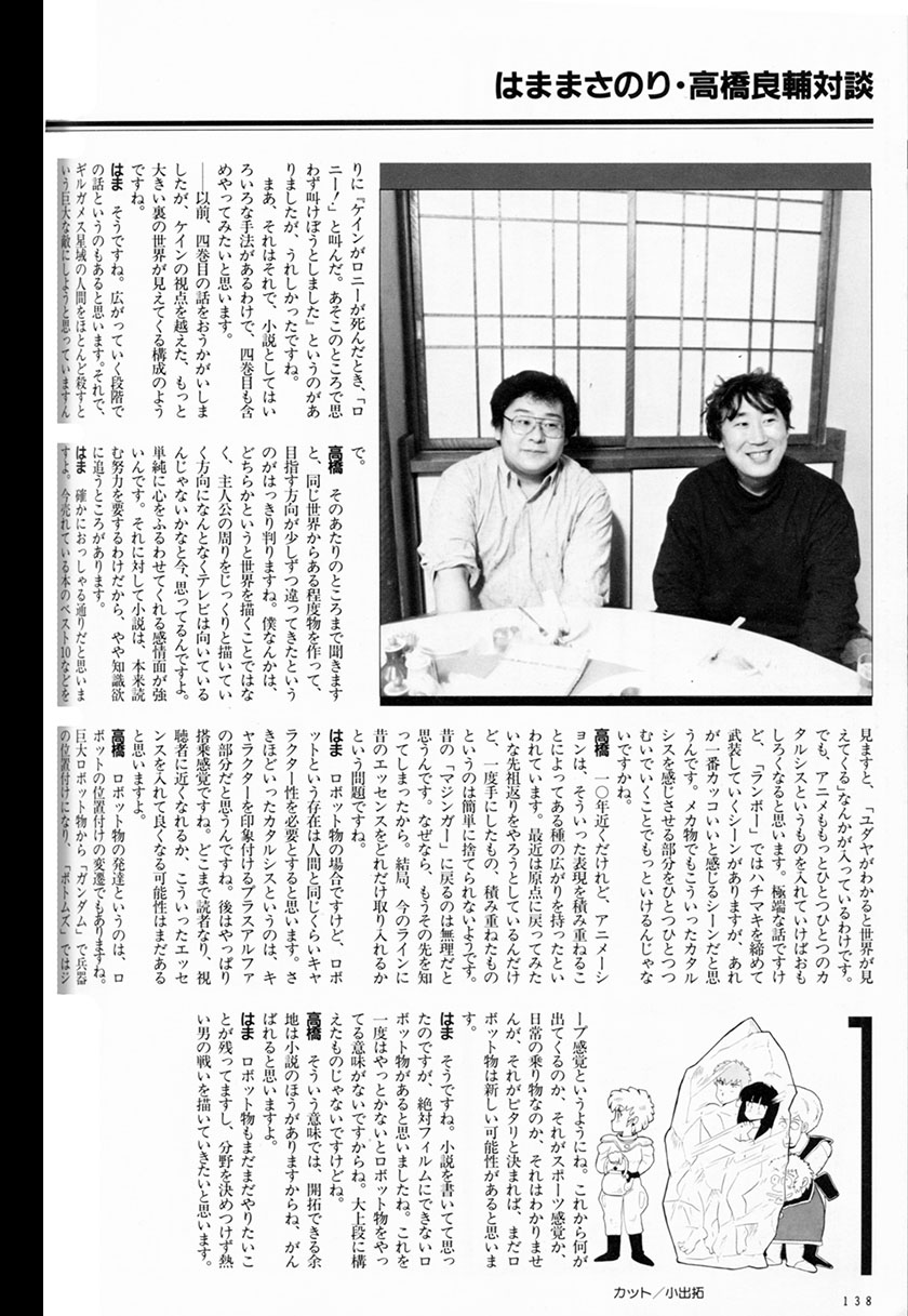 Takahashi: The development of robot shows also reflects the change in the way robots are perceived. Giant robots became just weapons in Gundam then became jeep-like in Votoms. I don’t know what will come out next, whether robots will become a sport or an everyday vehicle. I think there’s definitely still new potential for the robot genre.