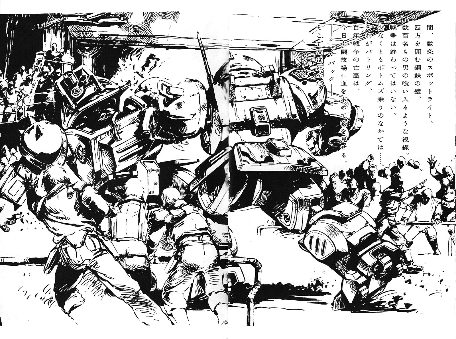 Darkness, multiple spotlights. Steel walls surround us on all sides. The piercing gazes of hundreds of men. The war is not over. At least among Votoms pilots…that is battling.