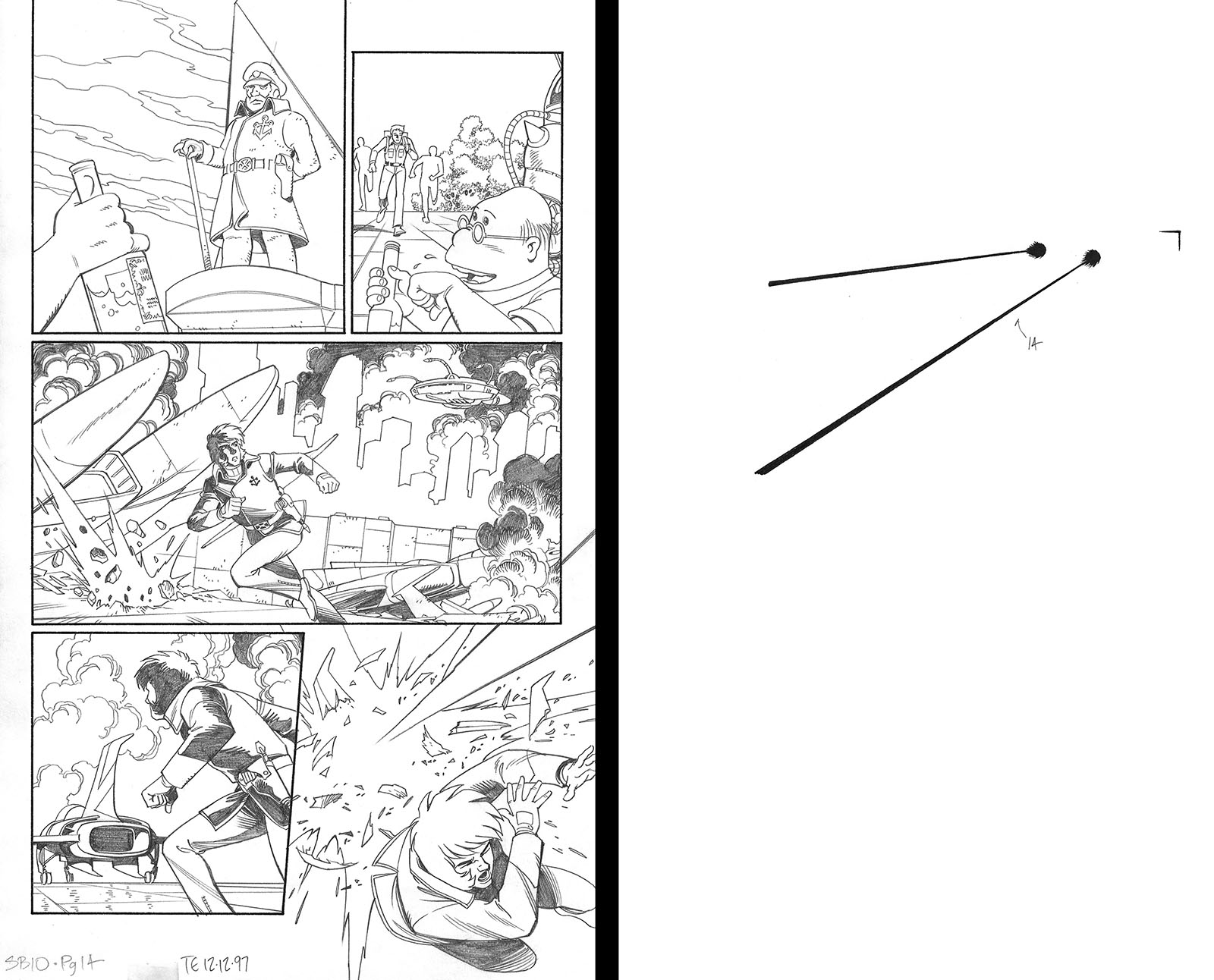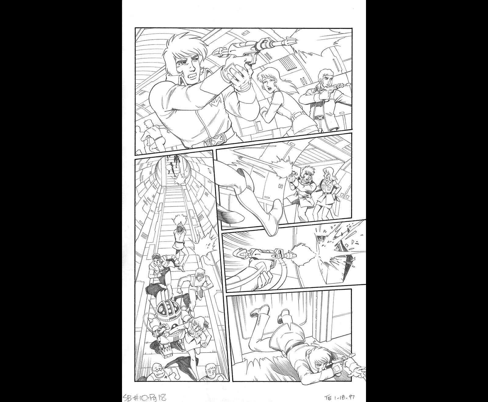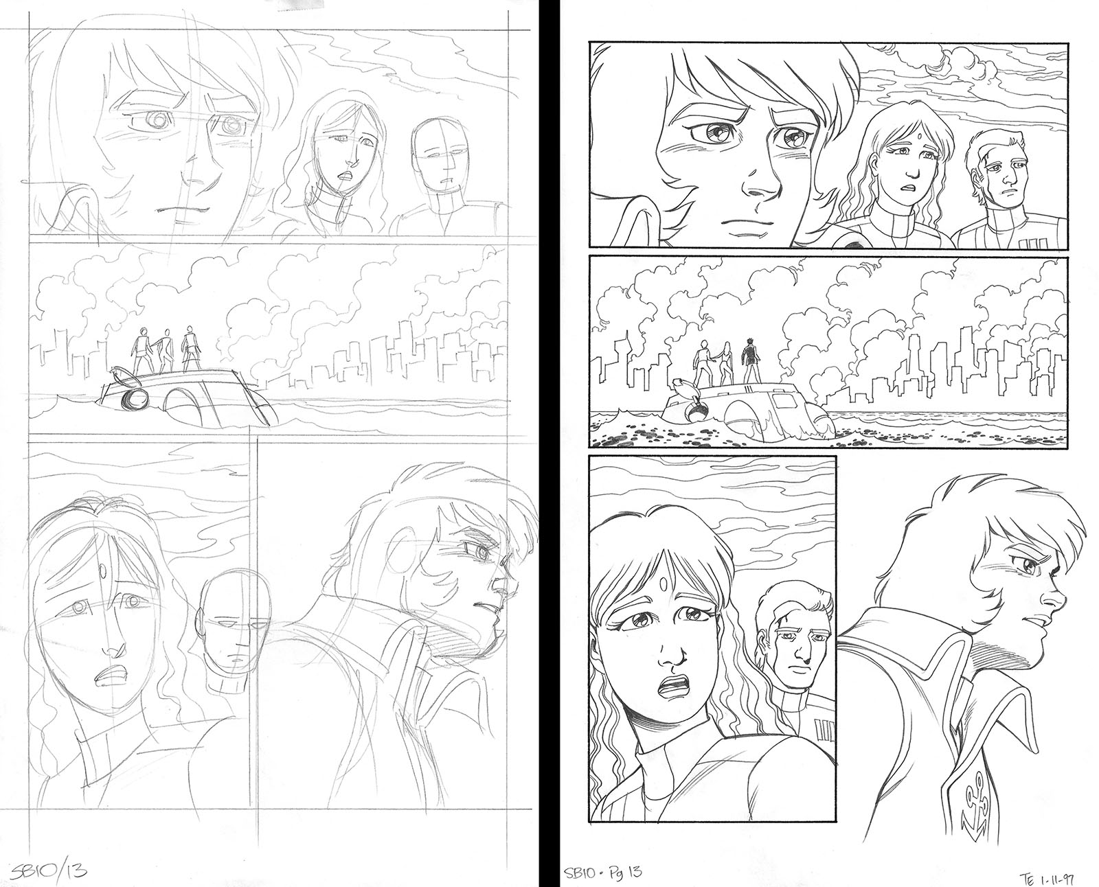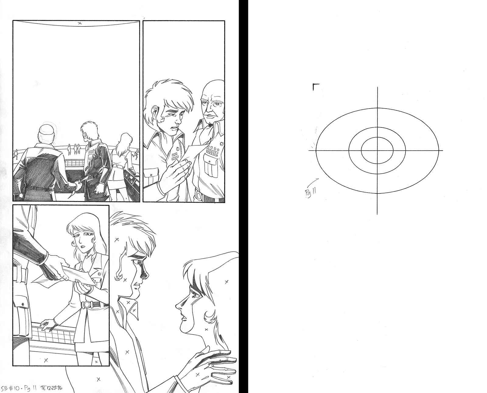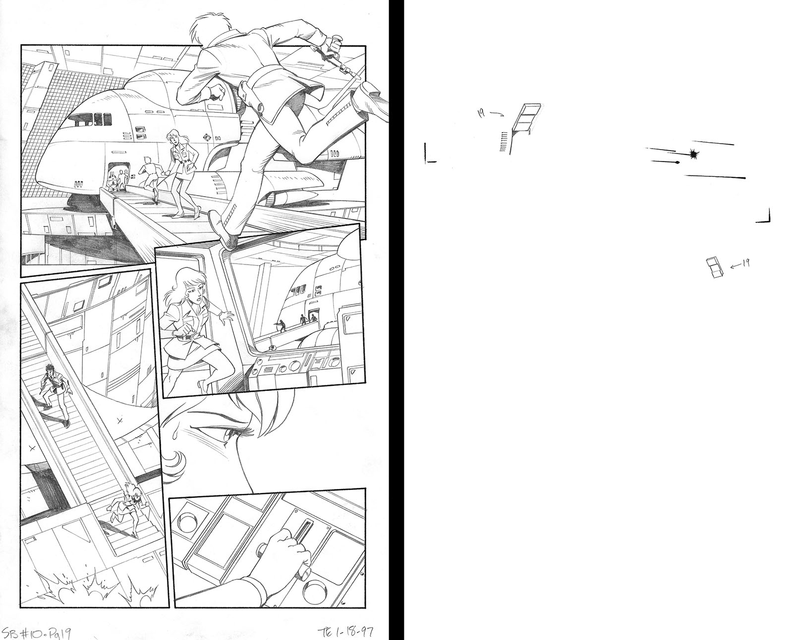 Be Forever was a dense, packed story that put a lot of demands on its audience. This was especially true of the first 27 minutes of screen time, which was the segment we committed to paper in this issue. Bruce Lewis took point to determine how the scenes would be broken down page by page. As with issue 9, I expanded his roughs into full size pages that captured the action.