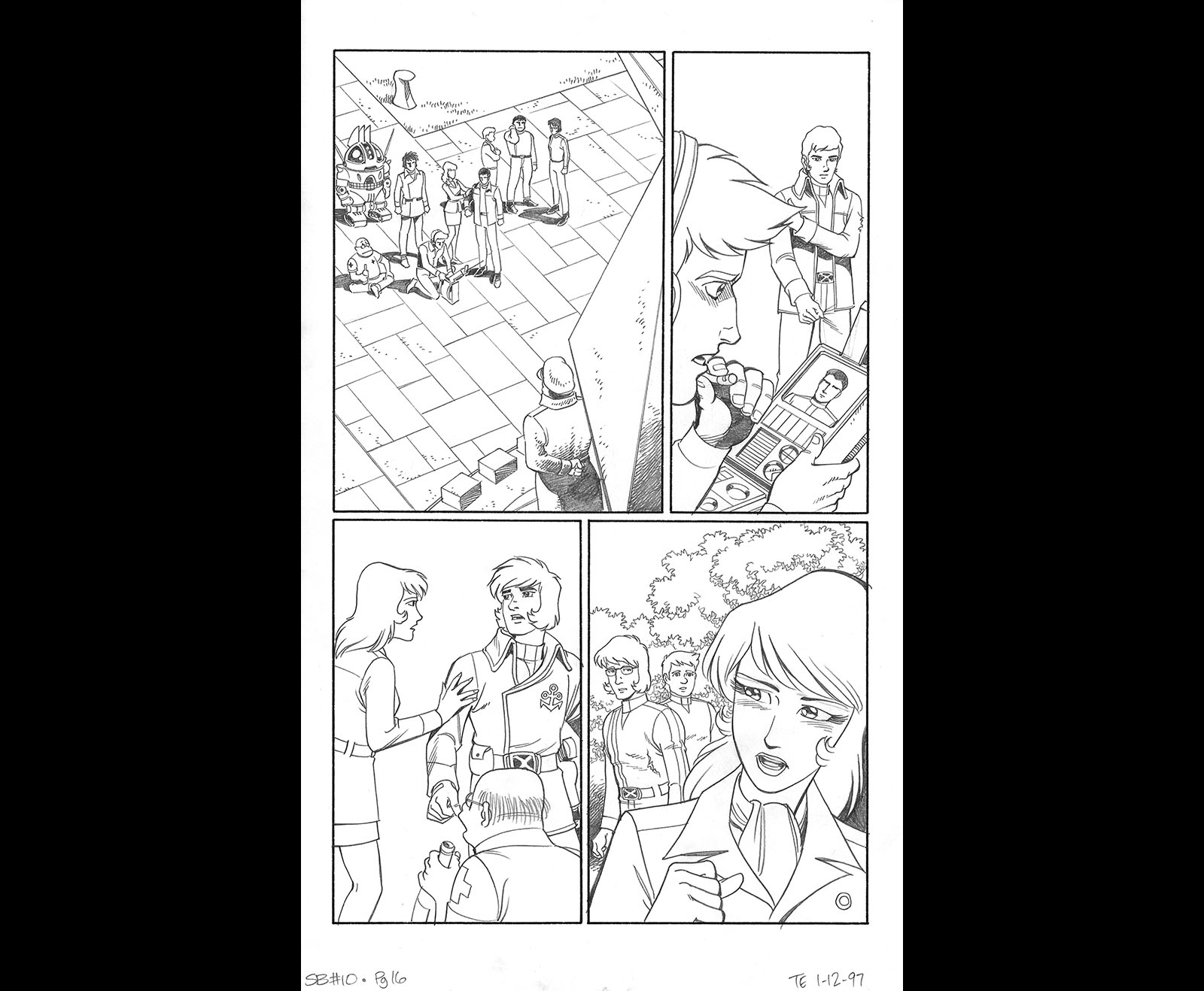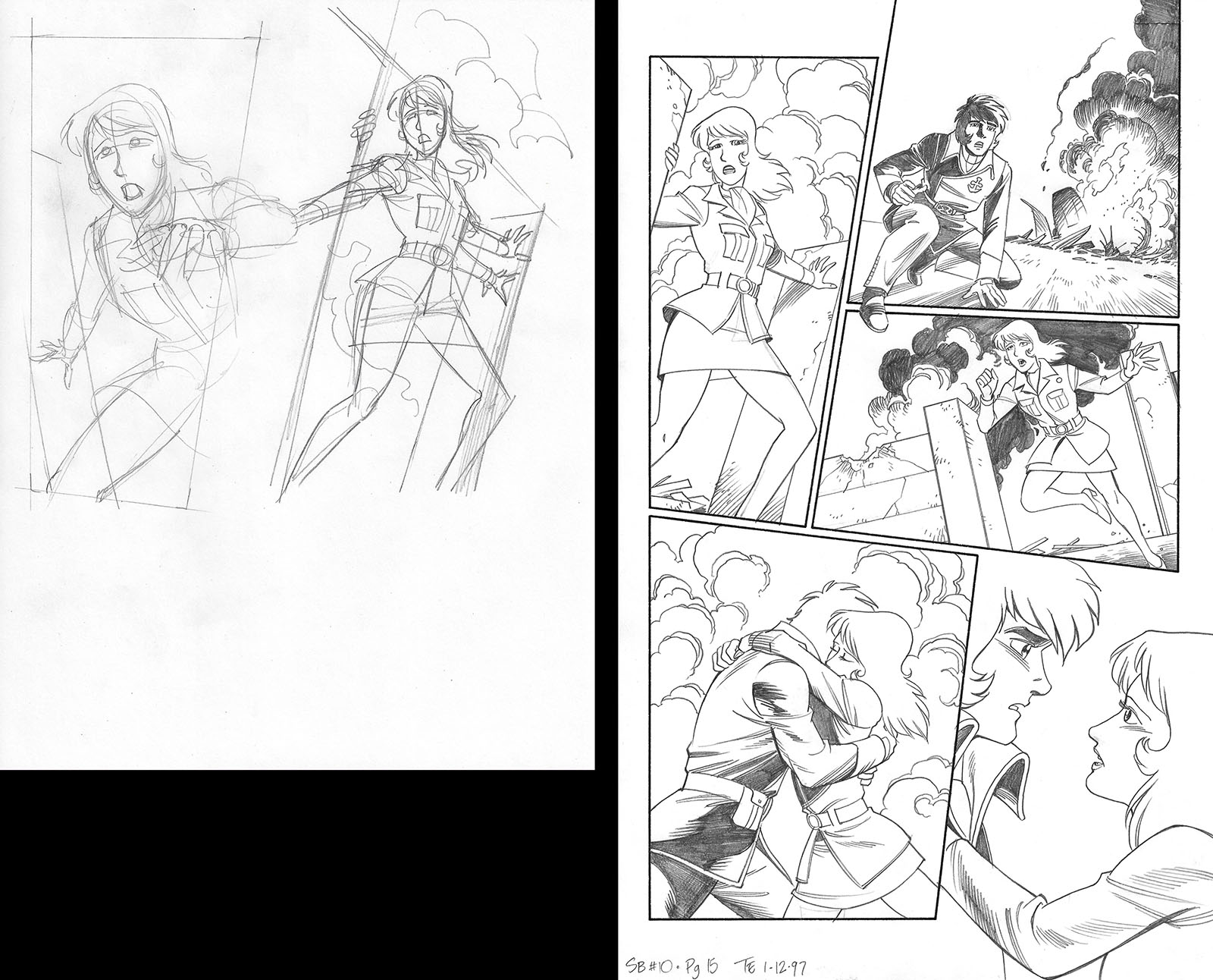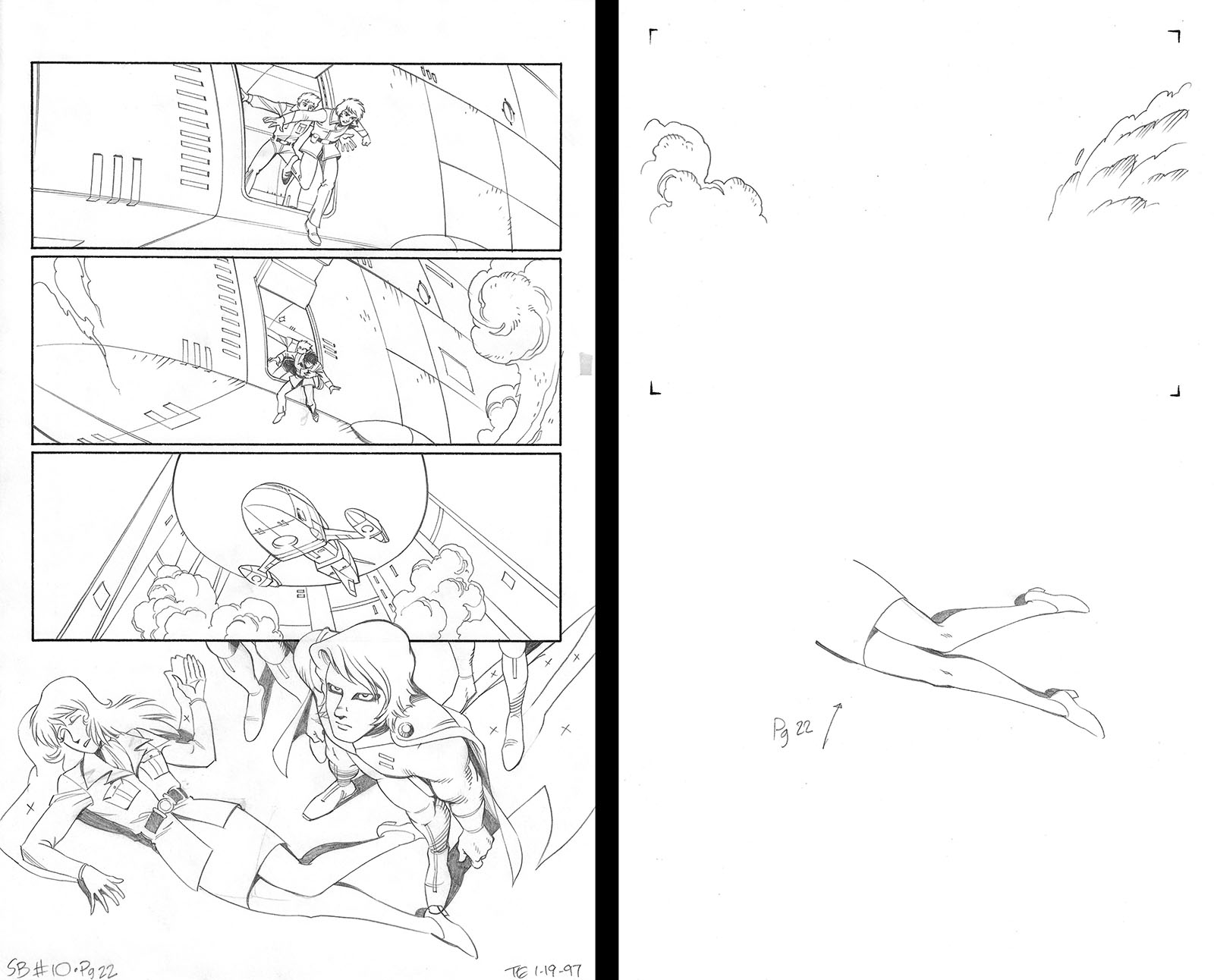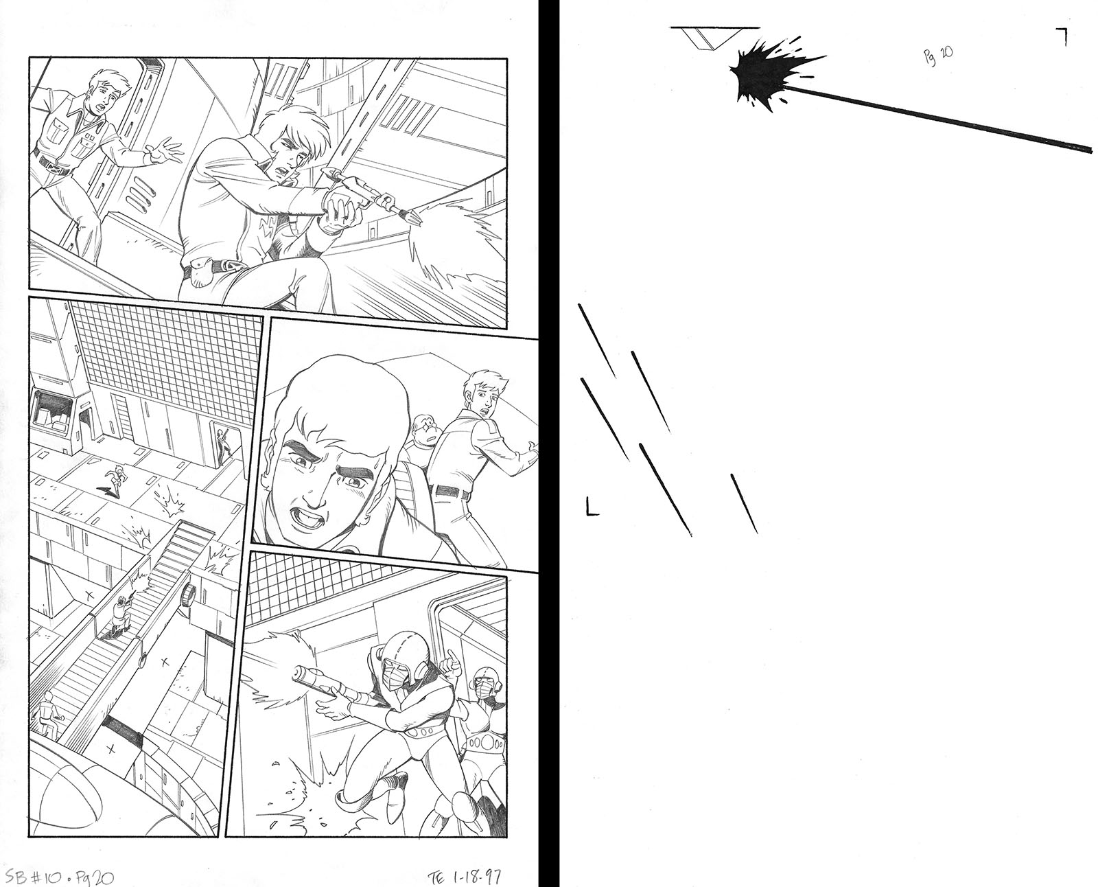 Be Forever was a dense, packed story that put a lot of demands on its audience. This was especially true of the first 27 minutes of screen time, which was the segment we committed to paper in this issue. Bruce Lewis took point to determine how the scenes would be broken down page by page. As with issue 9, I expanded his roughs into full size pages that captured the action.