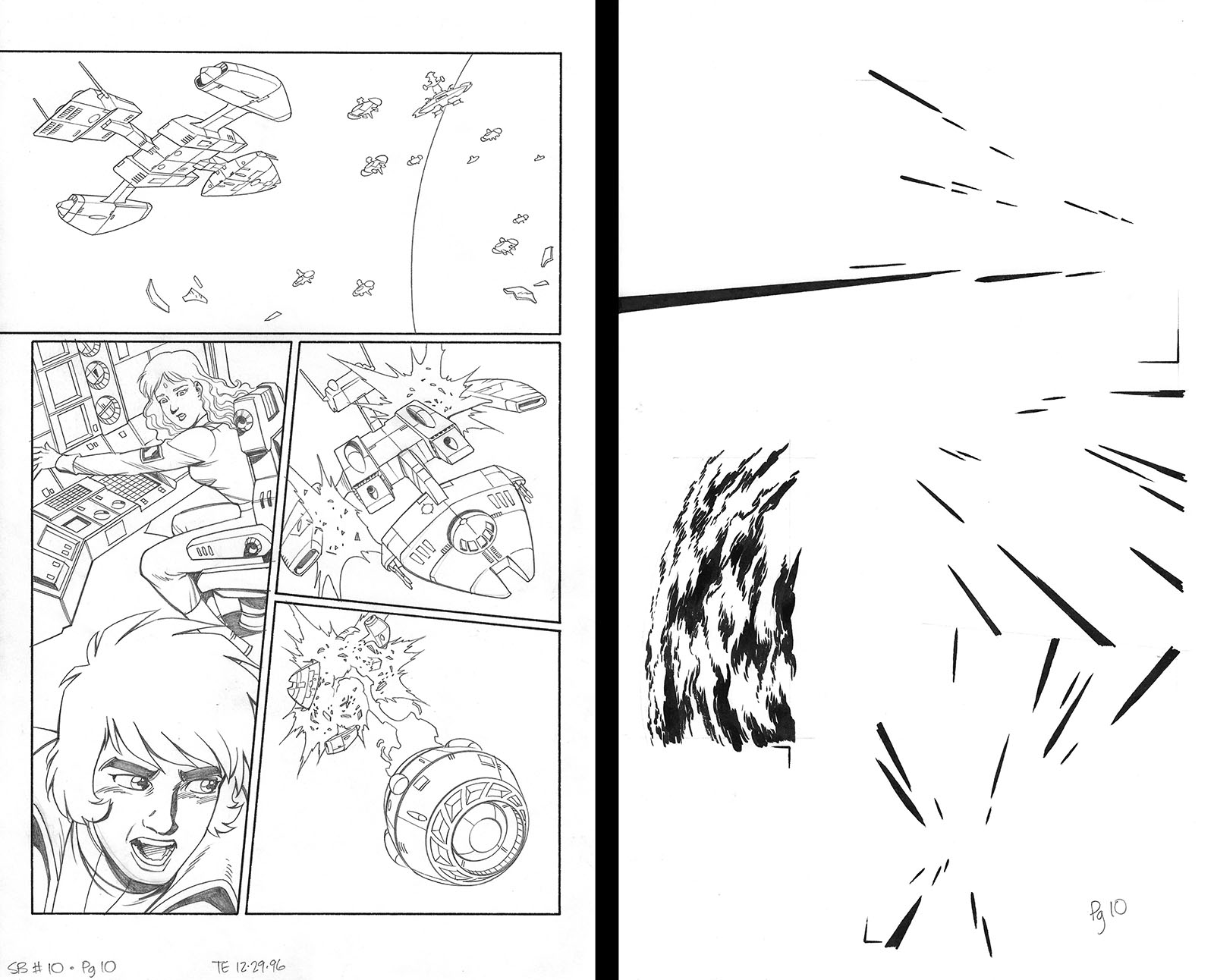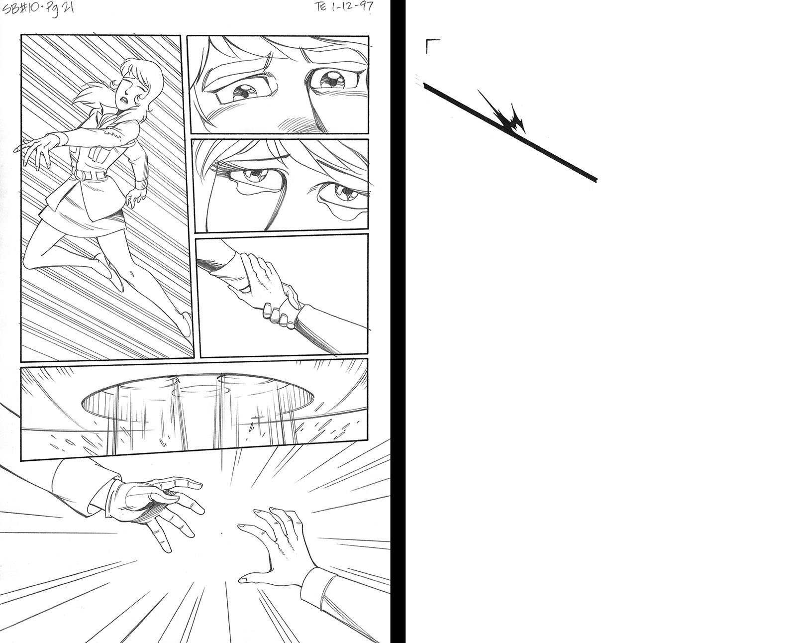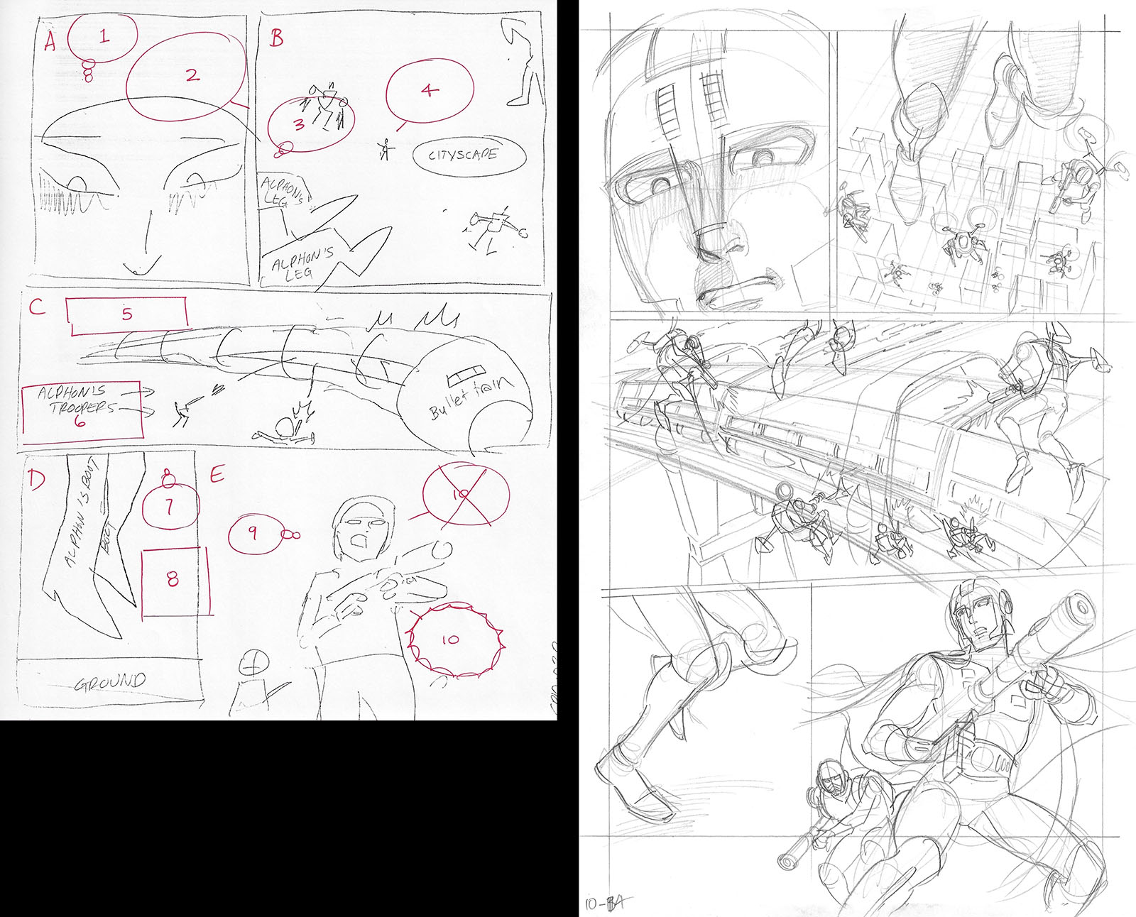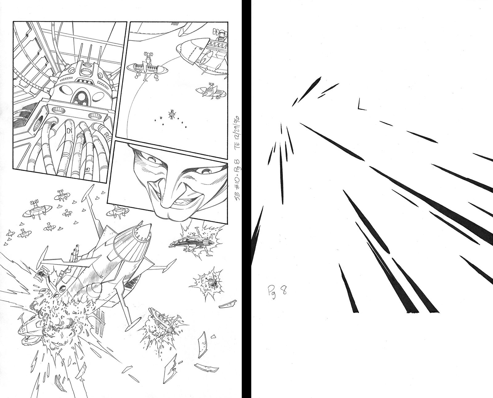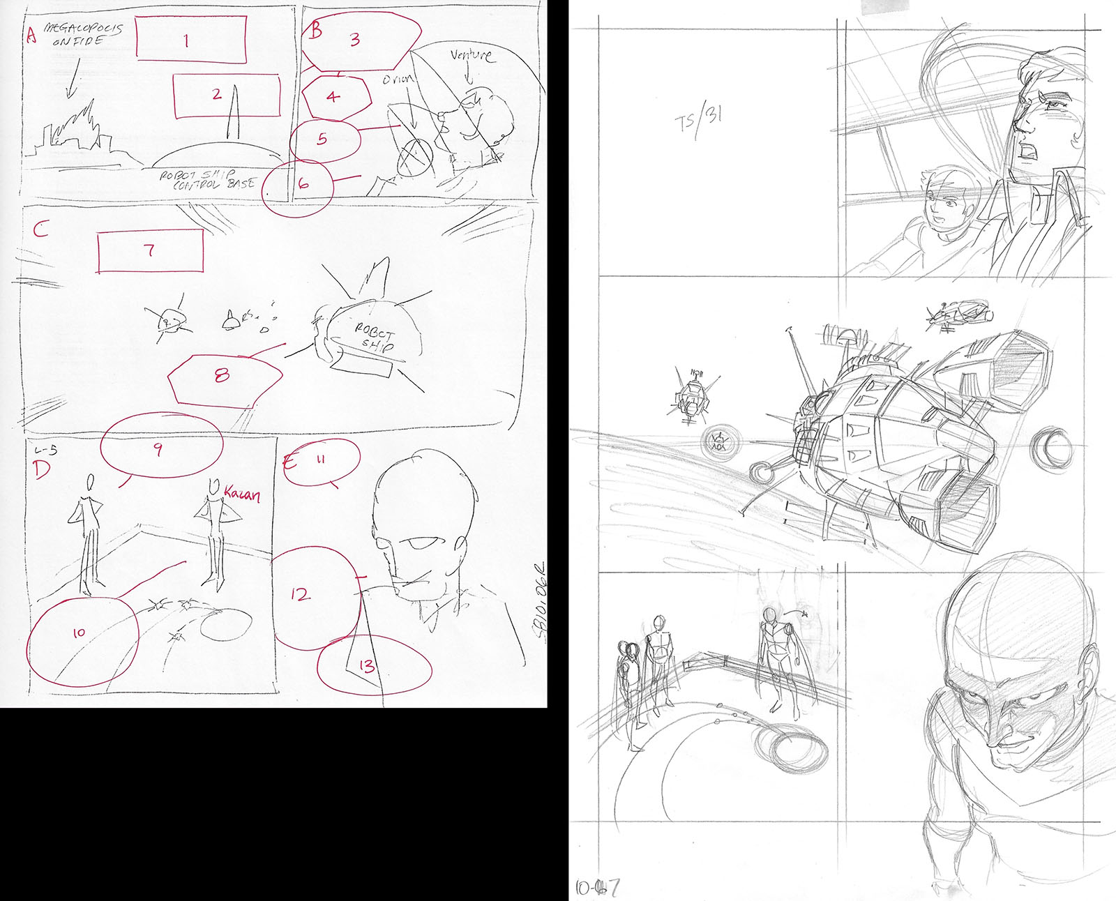 Be Forever was a dense, packed story that put a lot of demands on its audience. This was especially true of the first 27 minutes of screen time, which was the segment we committed to paper in this issue. Bruce Lewis took point to determine how the scenes would be broken down page by page. As with issue 9, I expanded his roughs into full size pages that captured the action.