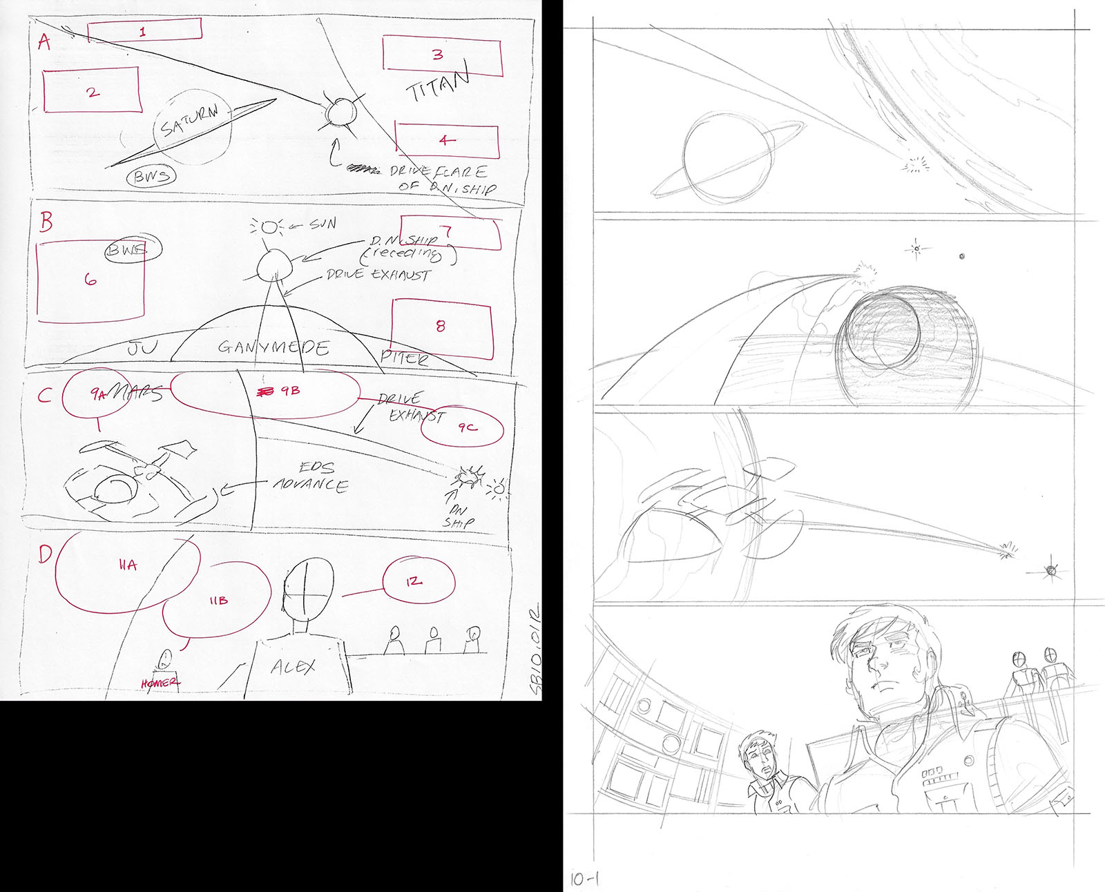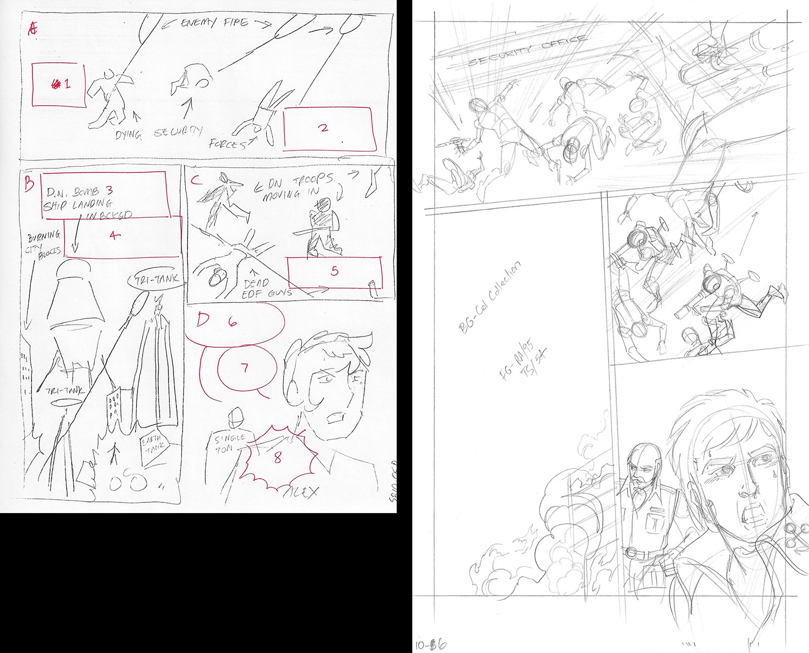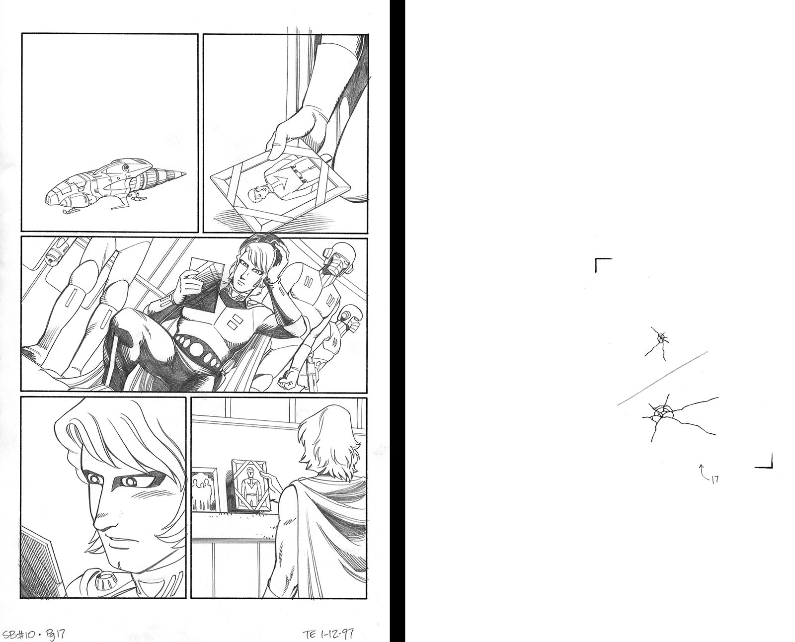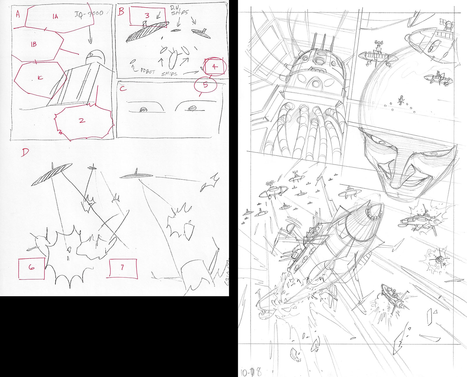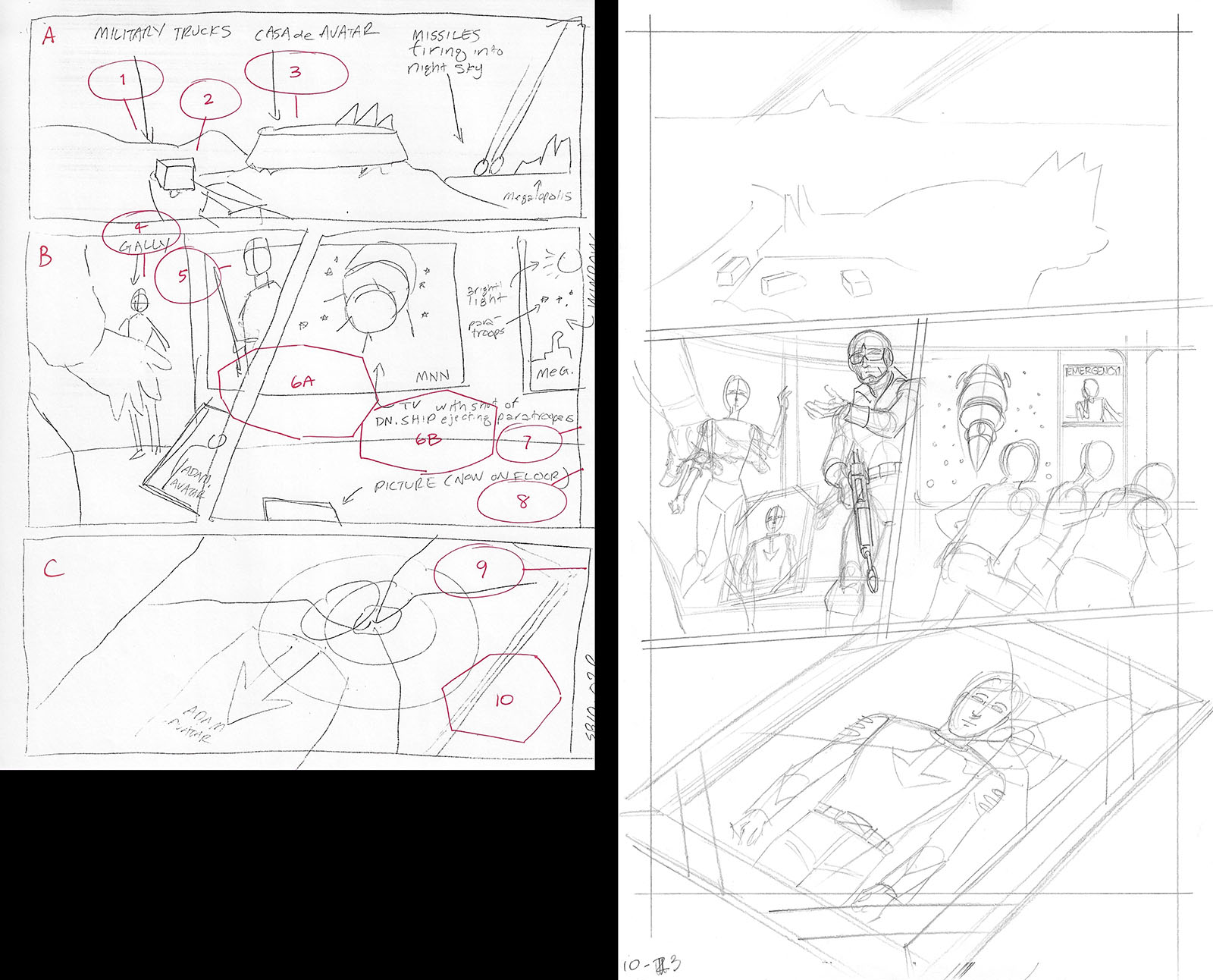 Be Forever was a dense, packed story that put a lot of demands on its audience. This was especially true of the first 27 minutes of screen time, which was the segment we committed to paper in this issue. Bruce Lewis took point to determine how the scenes would be broken down page by page. As with issue 9, I expanded his roughs into full size pages that captured the action.