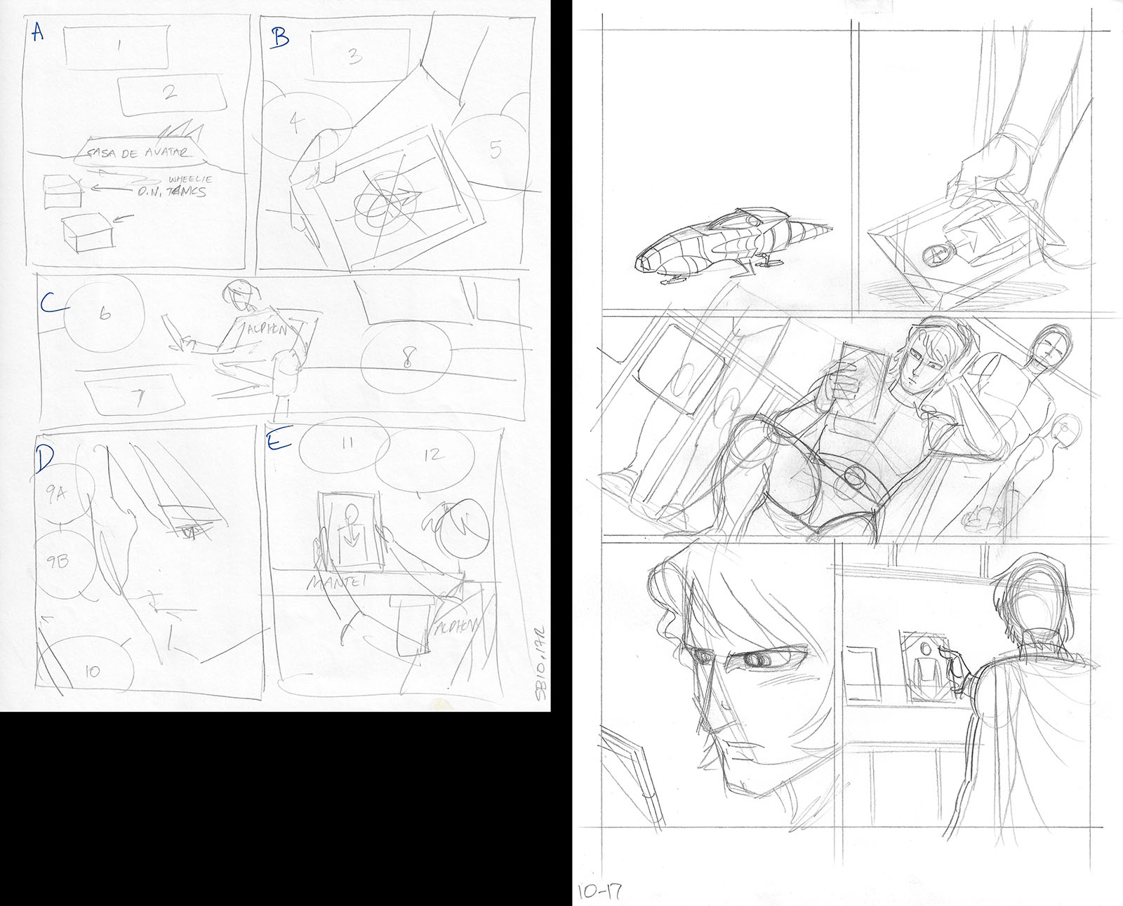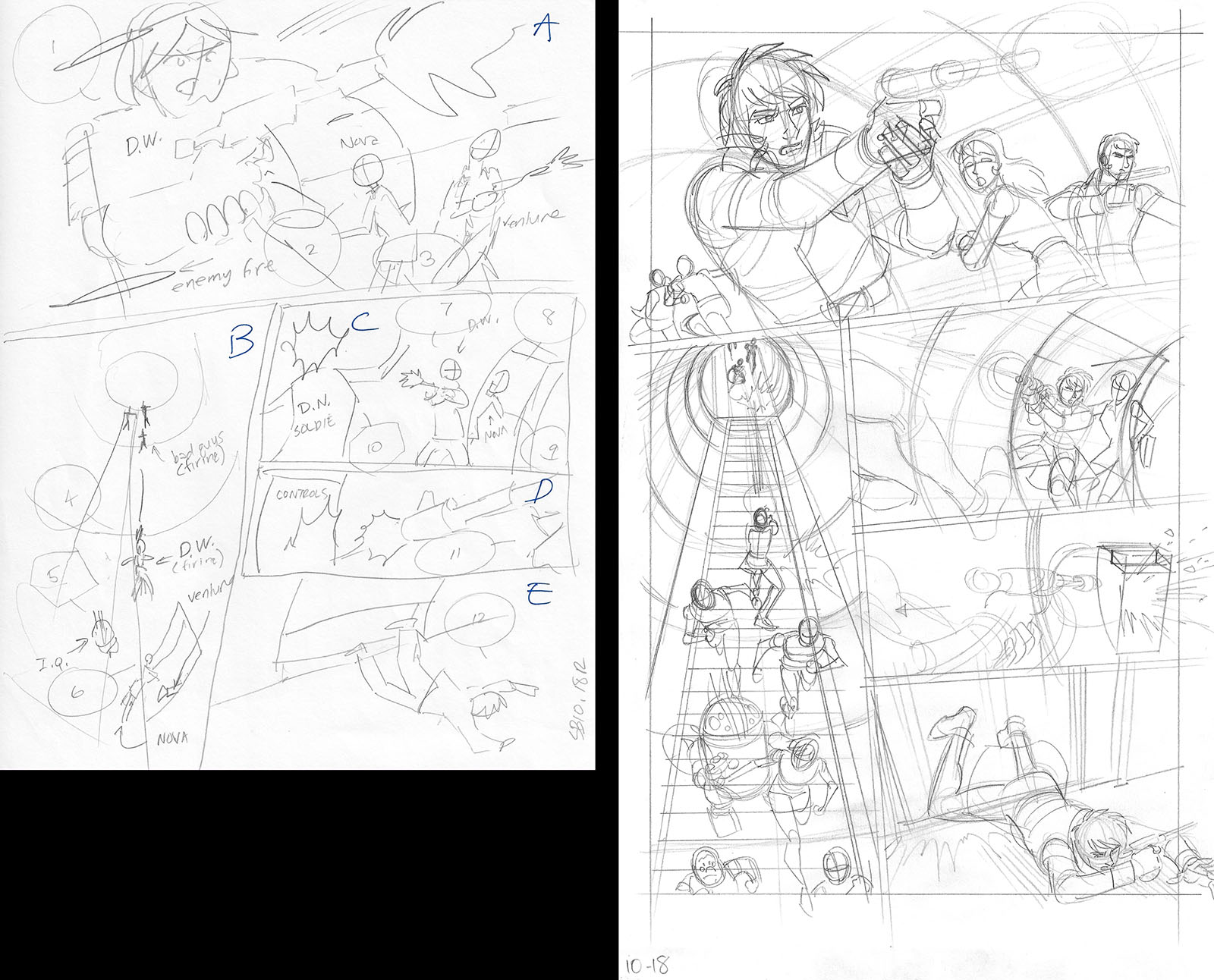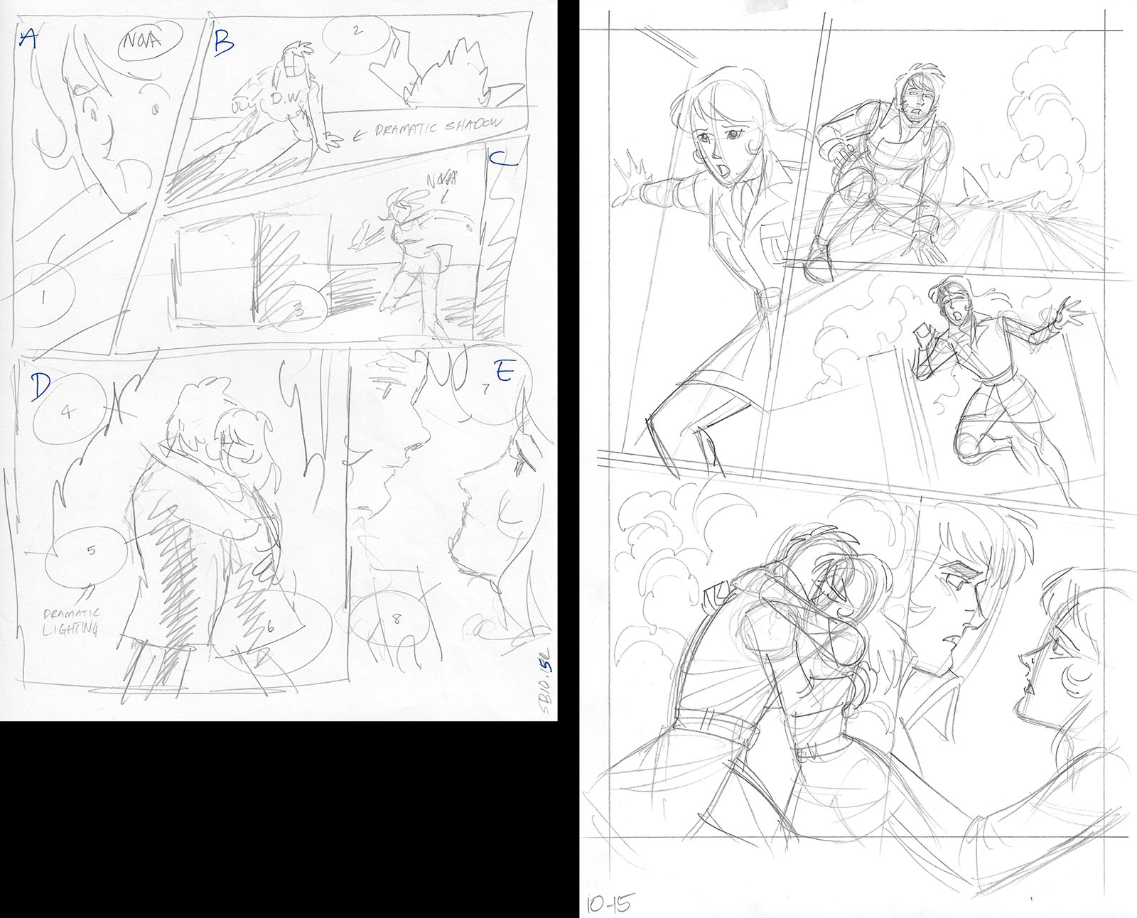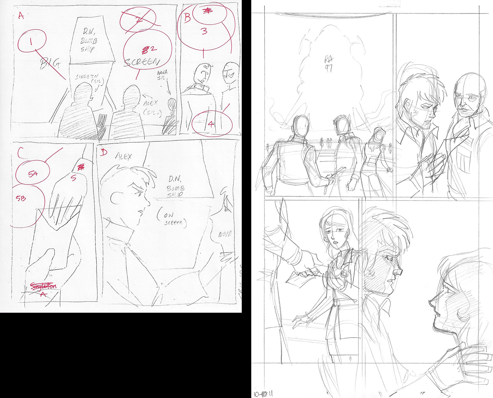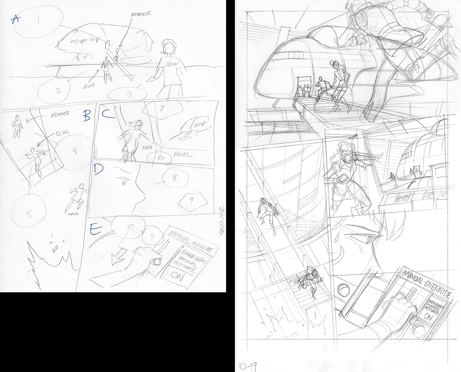 Be Forever was a dense, packed story that put a lot of demands on its audience. This was especially true of the first 27 minutes of screen time, which was the segment we committed to paper in this issue. Bruce Lewis took point to determine how the scenes would be broken down page by page. As with issue 9, I expanded his roughs into full size pages that captured the action.