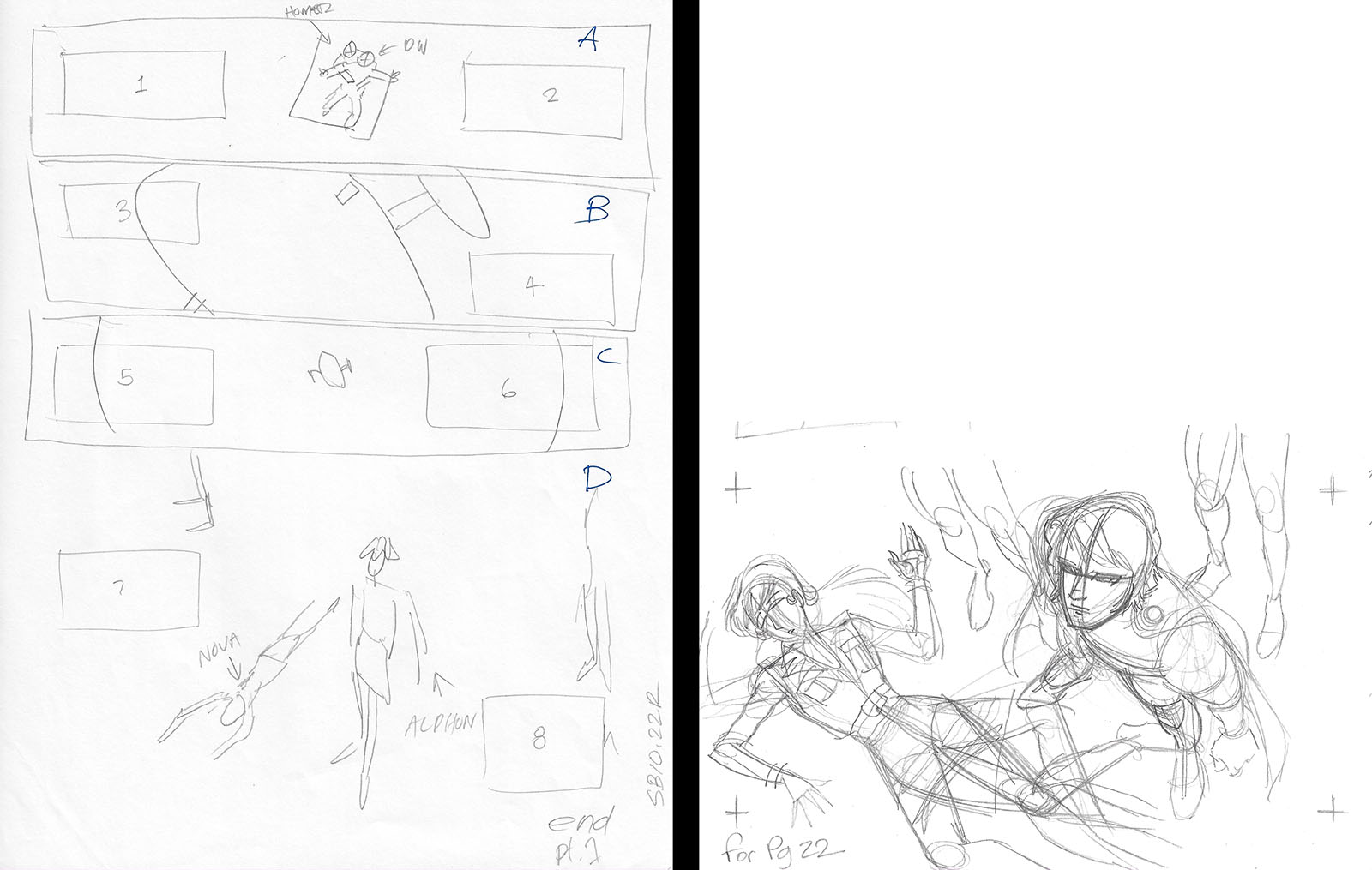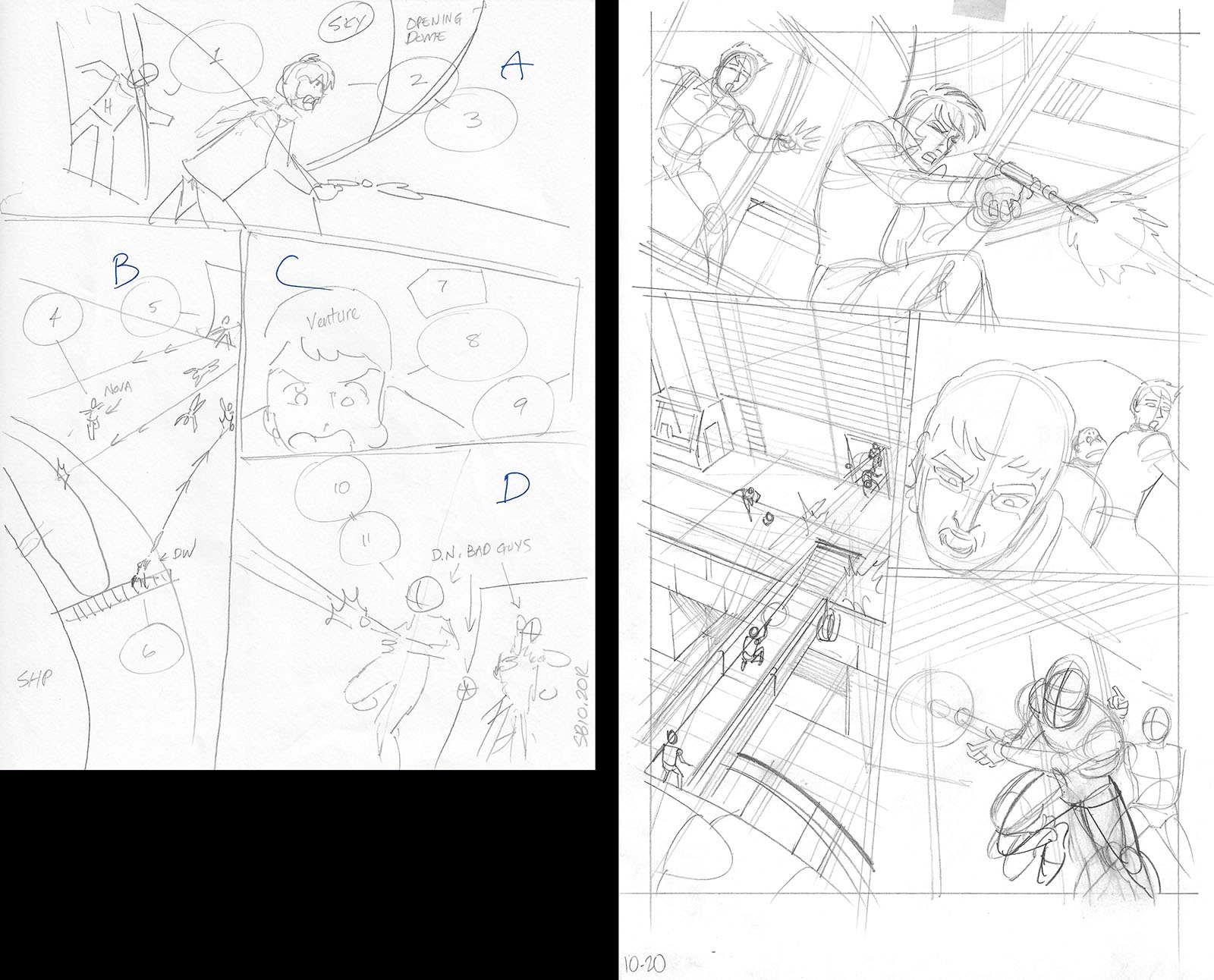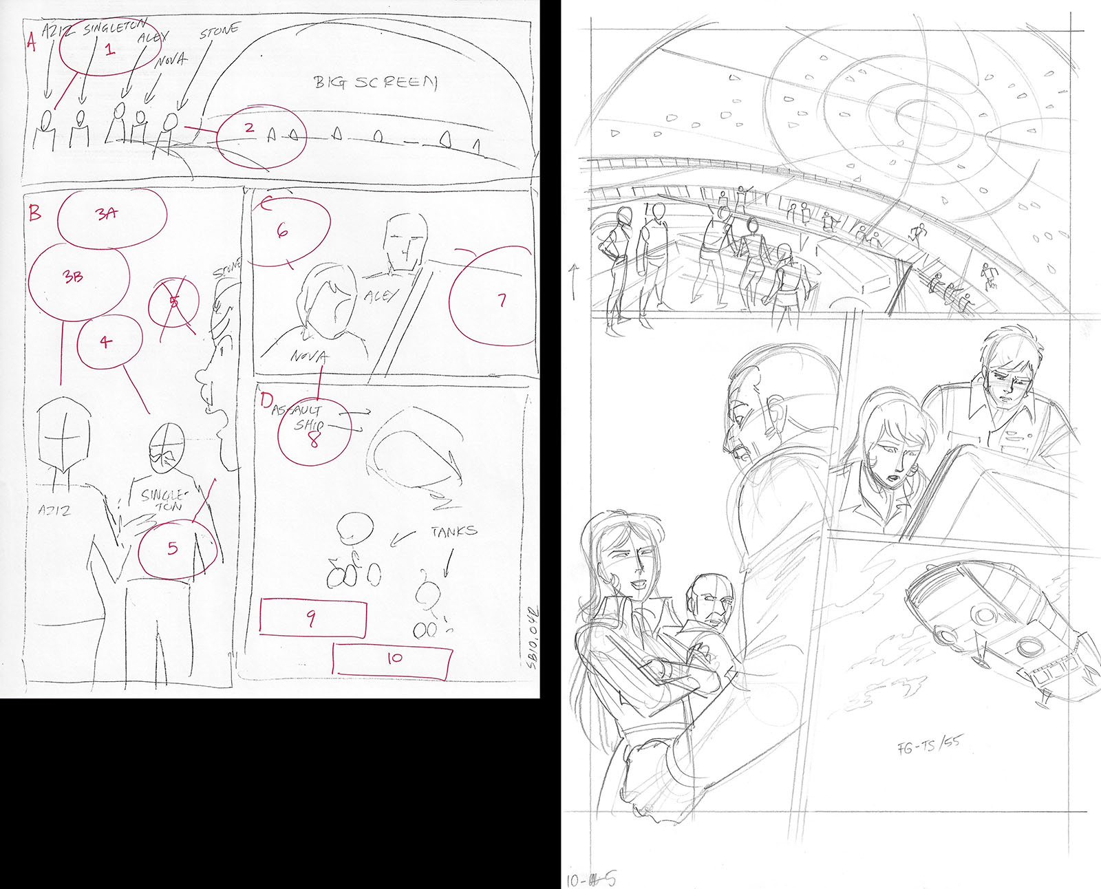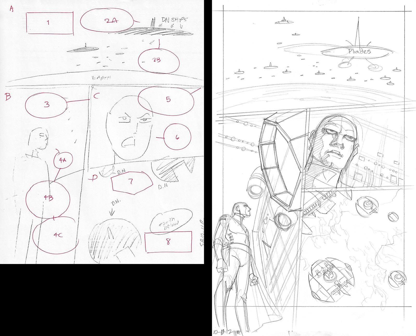 Be Forever was a dense, packed story that put a lot of demands on its audience. This was especially true of the first 27 minutes of screen time, which was the segment we committed to paper in this issue. Bruce Lewis took point to determine how the scenes would be broken down page by page. As with issue 9, I expanded his roughs into full size pages that captured the action.
