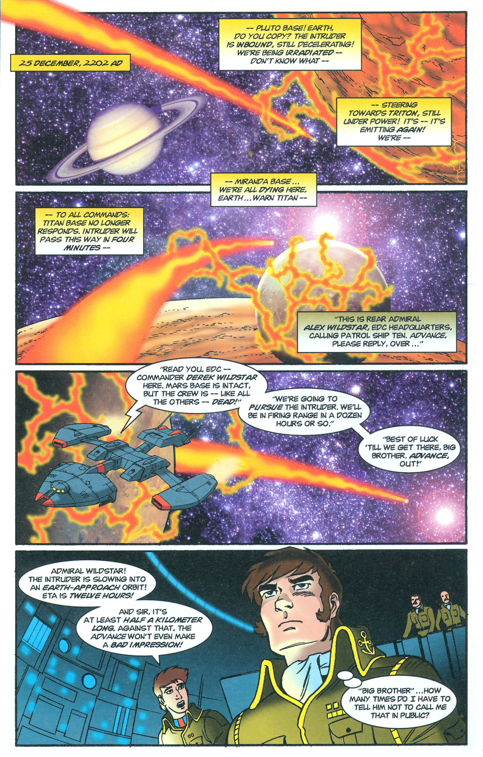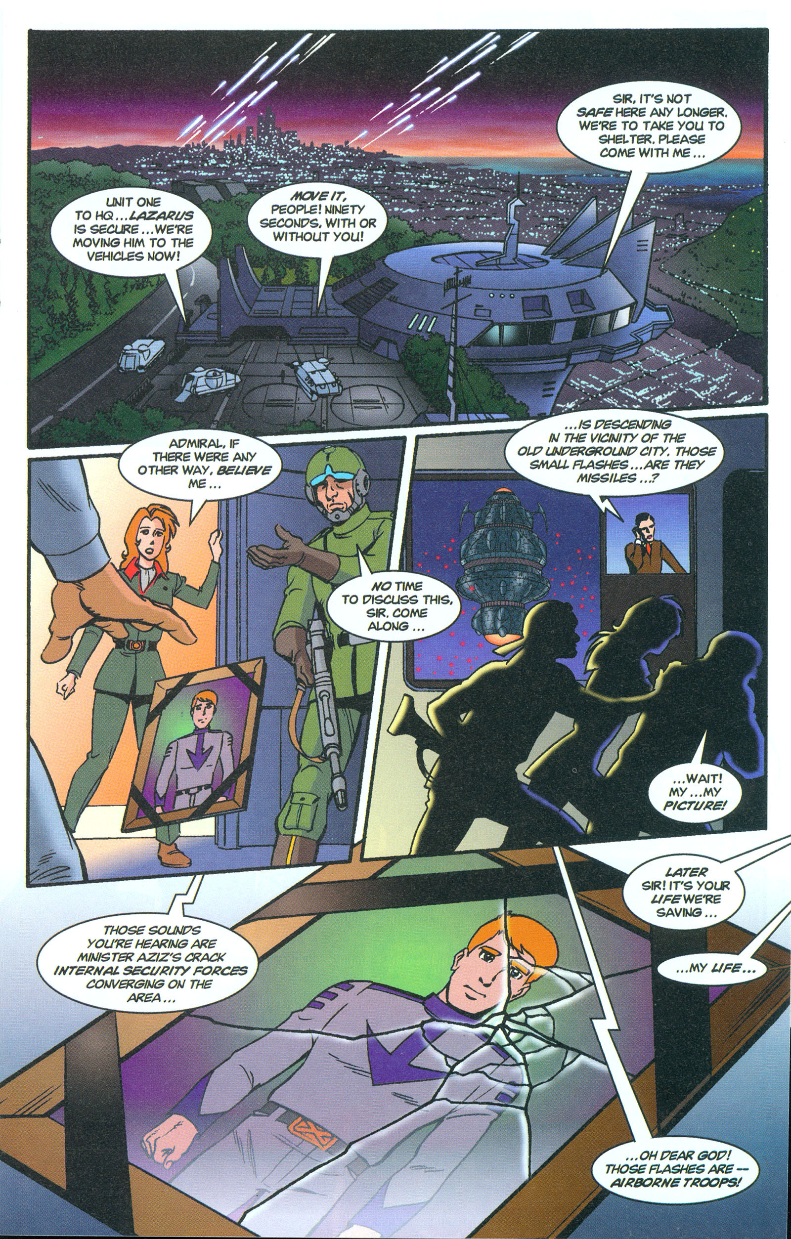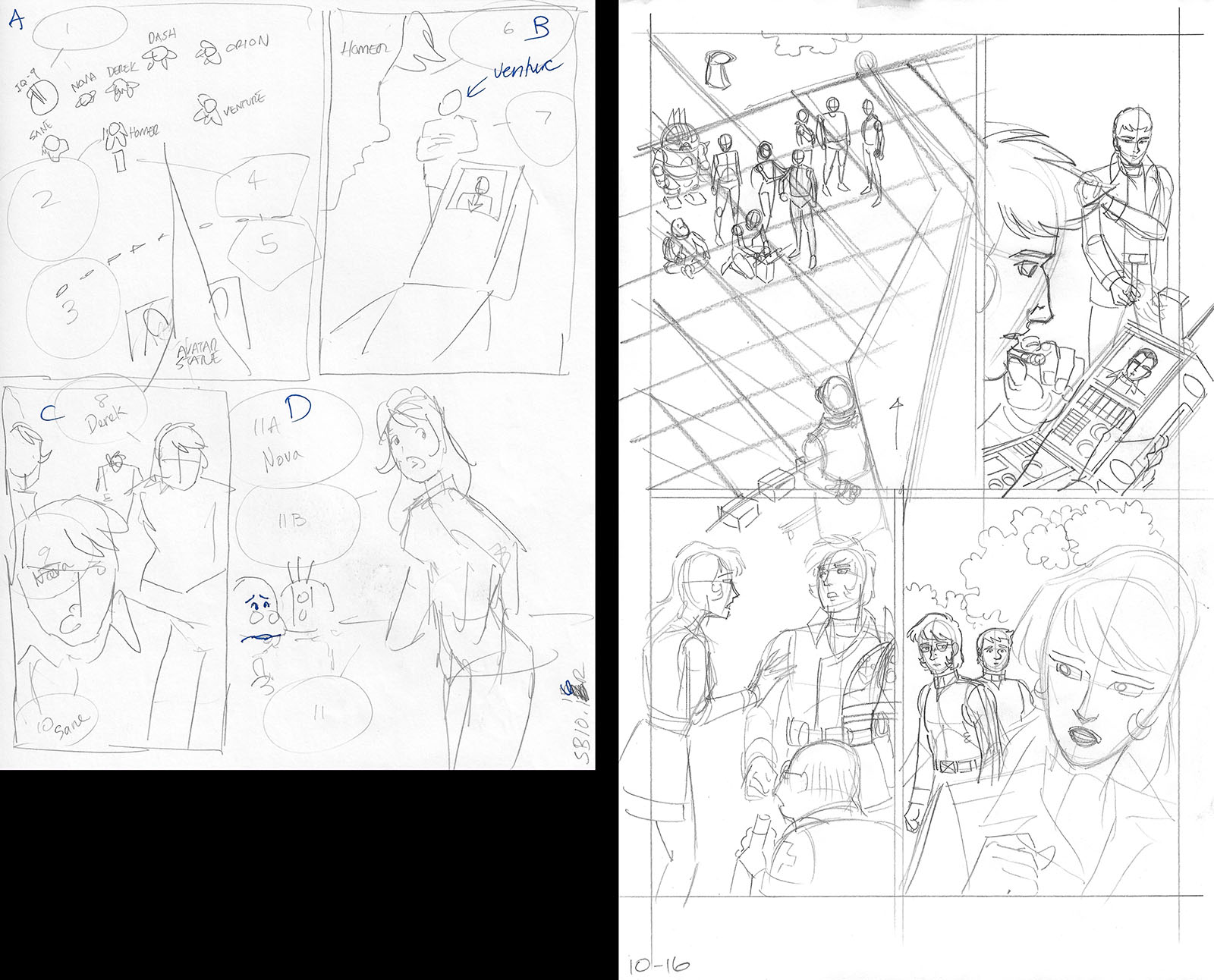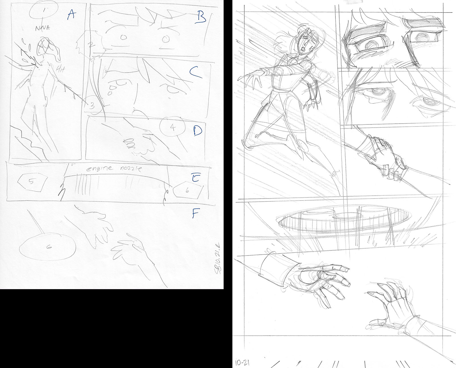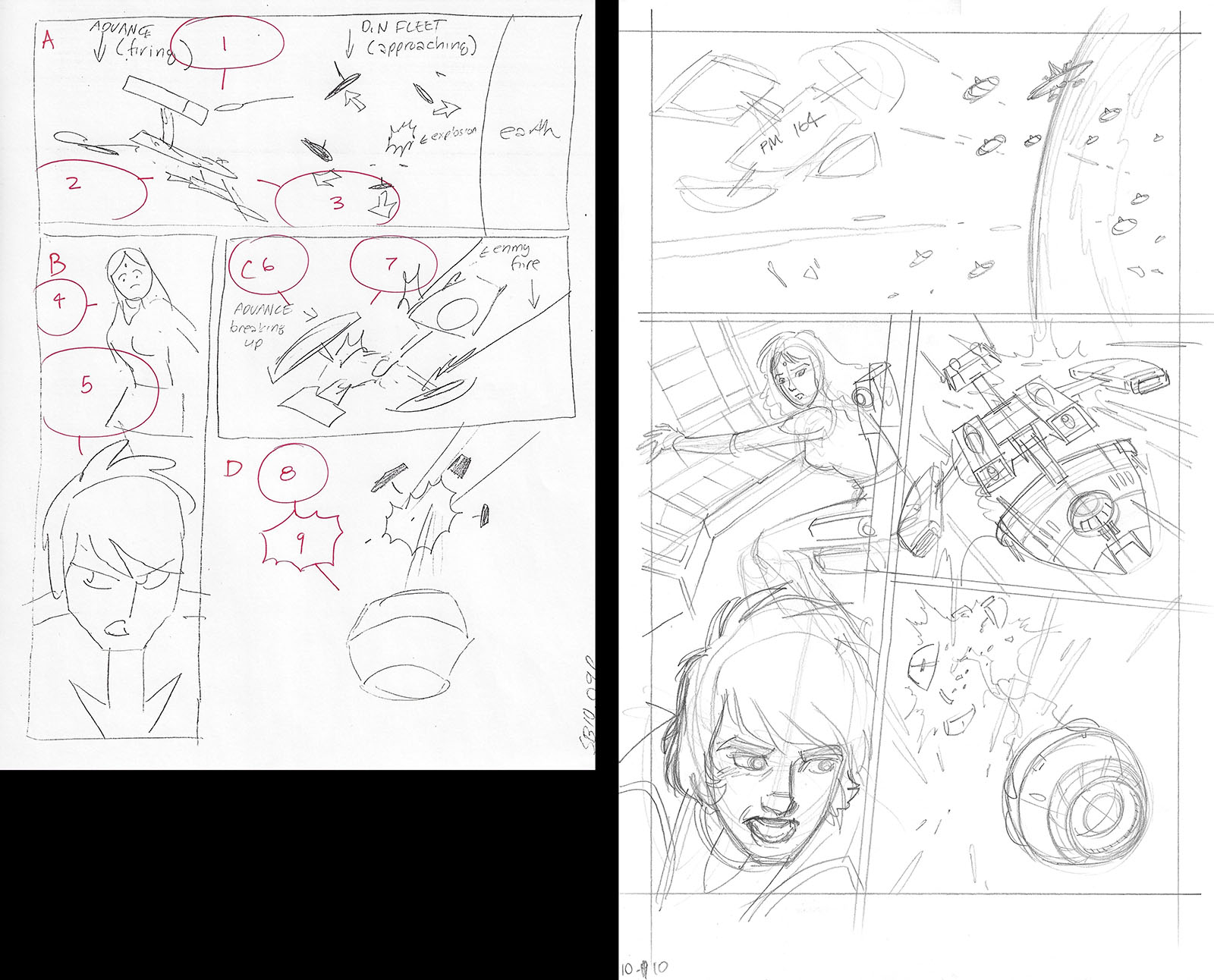 Be Forever was a dense, packed story that put a lot of demands on its audience. This was especially true of the first 27 minutes of screen time, which was the segment we committed to paper in this issue. Bruce Lewis took point to determine how the scenes would be broken down page by page. As with issue 9, I expanded his roughs into full size pages that captured the action.