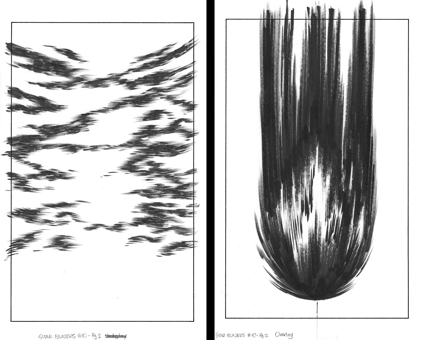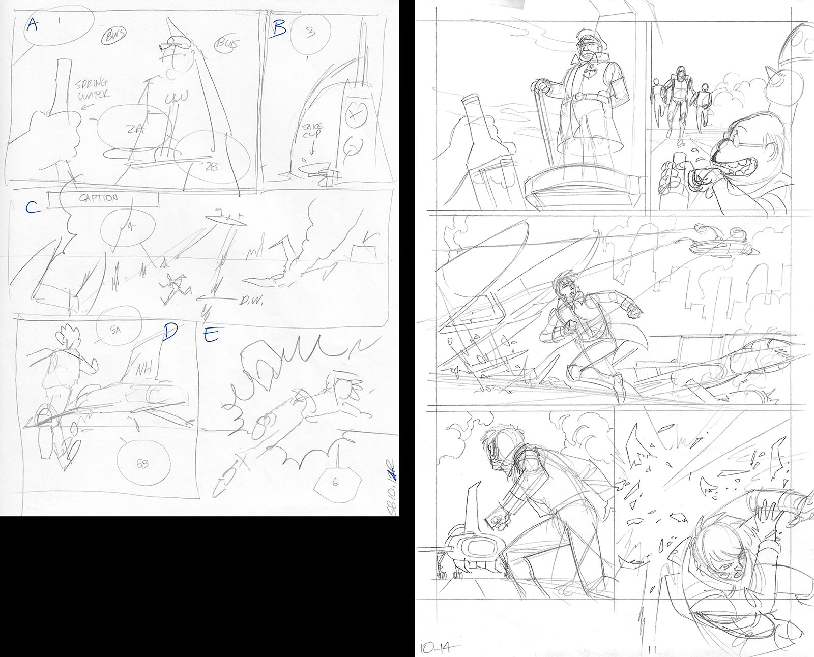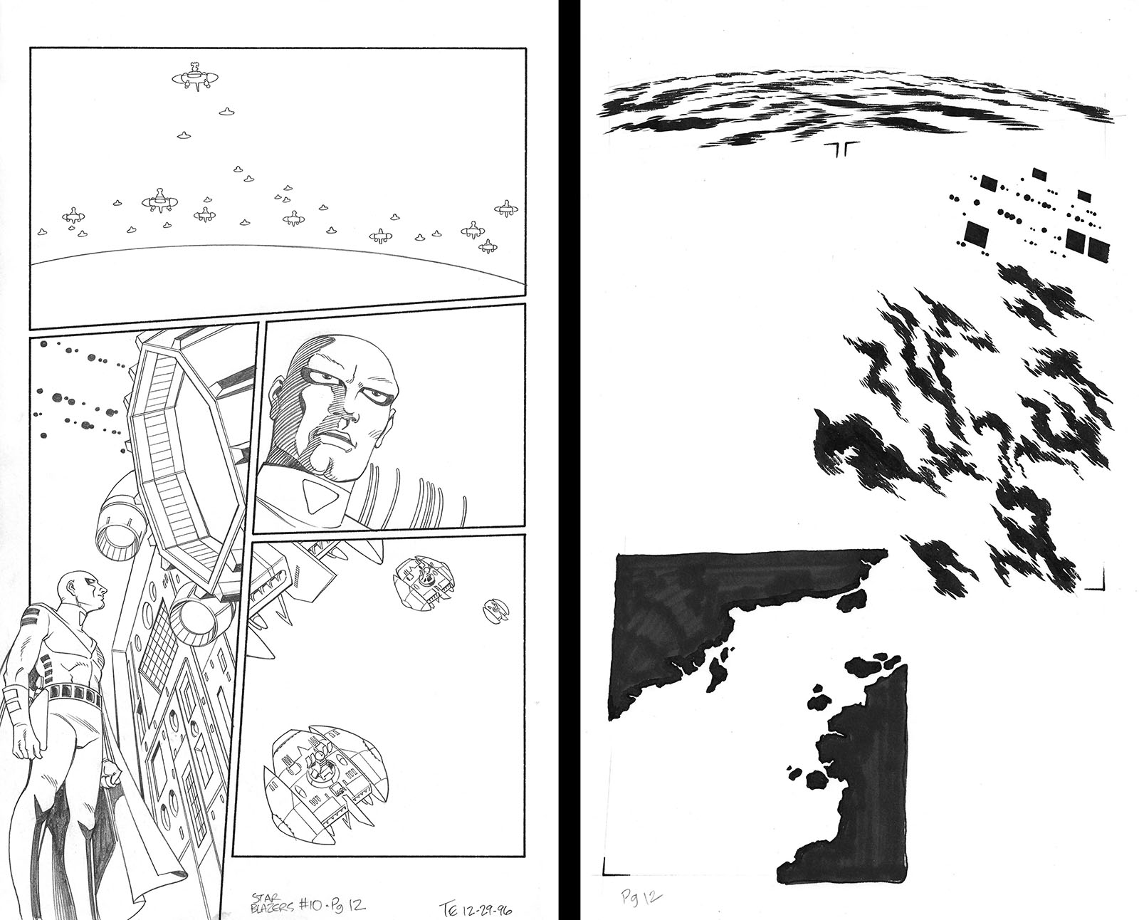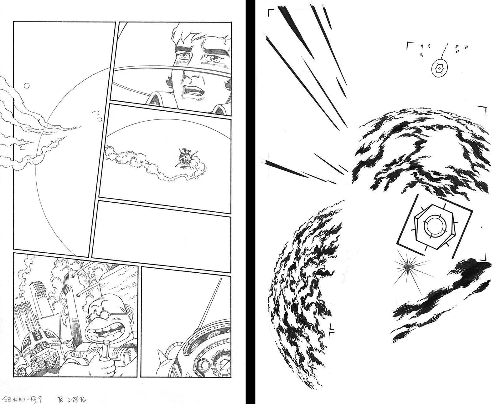 If you’d like to see how all the pieces came together, presented below are the production materials for each page, from Bruce’s rough to the final version. Between them you’ll see my expanded layouts, my finished art, and the extra elements for special effects. Some things aren’t visible here because they were either reused from a previous issue (like the house, which appeared in issue 9) or scanned from a Japanese source (like an occasional background).